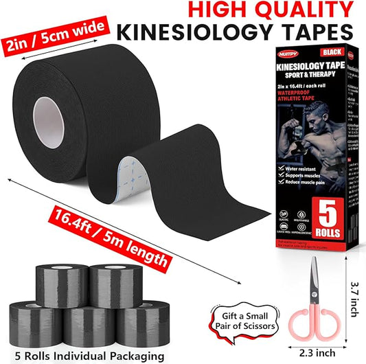 5 Rolls Kinesiology Tape, 2 inch x 16.4 Feet Waterproof Athletic Tape, Uncut Kinetic Tape, Muscle Tape, Sports Tape, Knee Tape for Exercise and Daily Use - Black