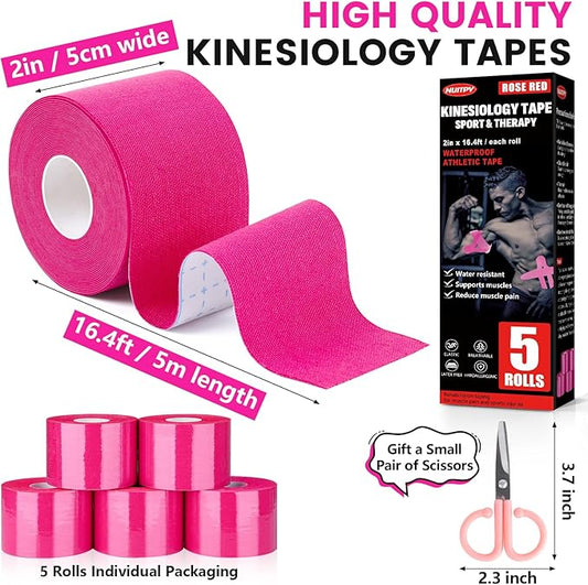 5 Rolls Kinesiology Tape, 2 inch x 16.4 Feet Waterproof Athletic Tape, Uncut Kinetic Tape, Muscle Tape, Sports Tape, Knee Tape for Exercise and Daily Use - Rose Red