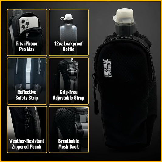 Handheld Running Water Bottle with Large Phone Holder – 12oz Grip-Free Hydration Flask with Pocket for Cards & Keys – Adjustable Strap for Walking, Running, Hiking, Marathons