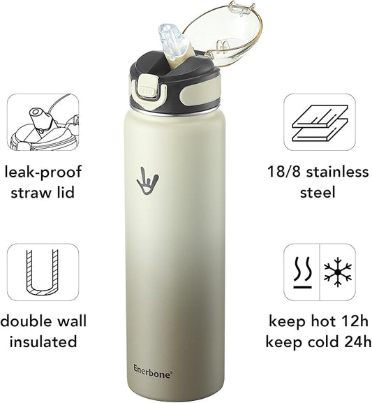 Enerbone 24 oz Insulated Water Bottle, Stainless Steel Bottle with Carrying Strap, Double-Wall Vacuum Insulation Design, Leakproof Sports Bottle with Straw, Keep Drinks Cold or Hot for Hours