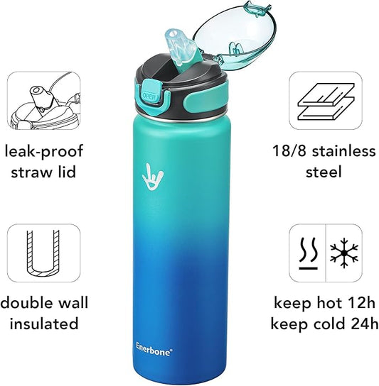 Enerbone 24 oz Insulated Water Bottle, Stainless Steel Bottle with Carrying Strap, Double-Wall Vacuum Insulation Design, Leakproof Sports Bottle with Straw, Keep Drinks Cold or Hot for Hours