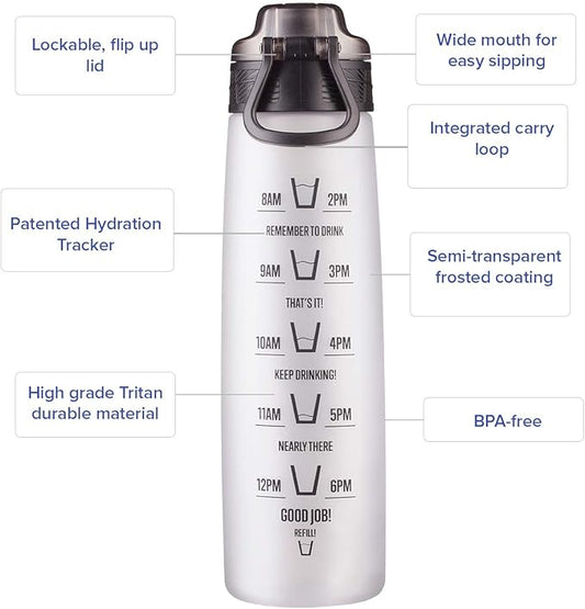 HYDRATEM8 - Active Motivational Sports Water Bottle with Time Markings, BPA Free, Drinks Bottle, 32oz - Frosted