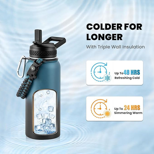 Insulated Water Bottle 32 oz, Triple Wall Vacuum Stainless Steel (Cold for 48 Hrs, Hot for 24Hrs), Leak Proof & Non-BPA, 32oz Hydro Water Flask with Paracord Handle & Straw Spout Lids