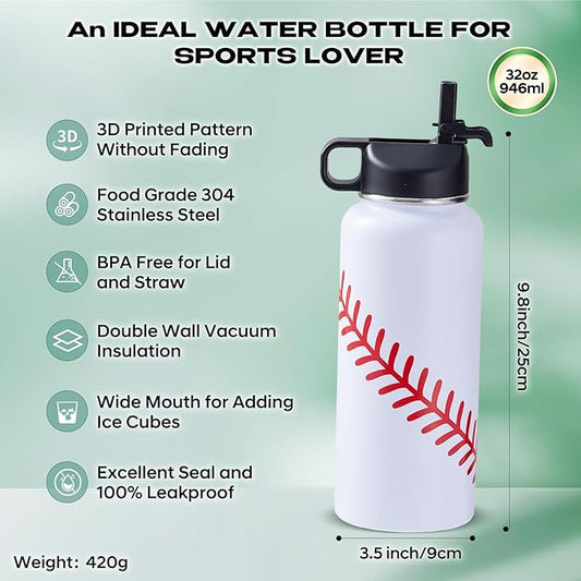 Baseball Water Bottles for Boys 32 oz and 100 PCS Baseball Stickers Sports Insulated Stainless Steel Water Bottle Baseballs Accessories Stuff Gear Gifts For 8-12 12-14 Player
