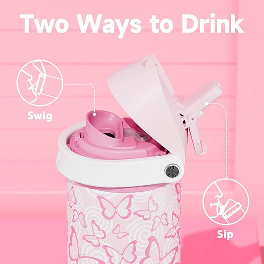 24 oz Insulated Water Bottle with Straw: Meoky Stainless Steel Metal Water Bottle with 2-in-1 Lid - Leak Proof, Cold for 24 Hours, Protective Silicone Base, BPA-Free for Sports Travel Car, Butterfly