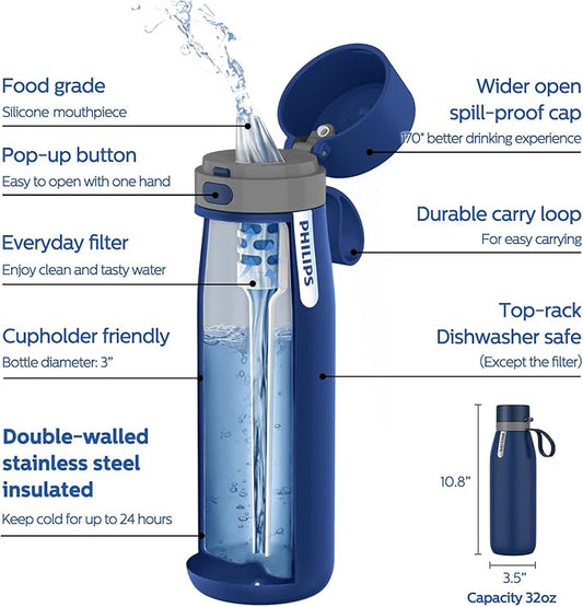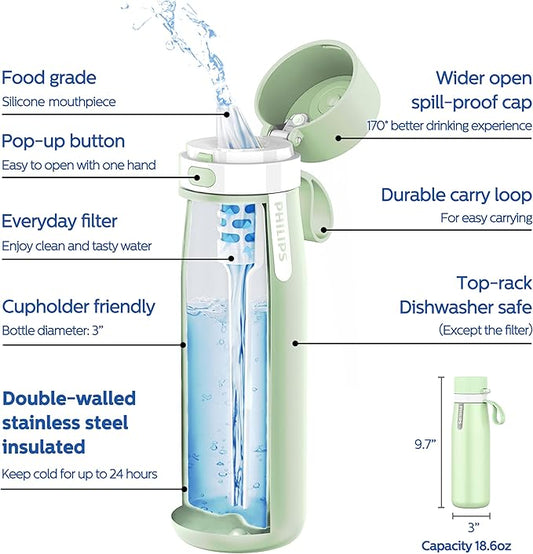 PHILIPS Water Bottle with Filter, Filter Water Bottle Stainless Steel with GoZero Everyday BPA-Free Tap Water Filter, Water Filter Bottle Keep Drink Cold 24 Hours, 1 Filter for 40 gal / 2 Months