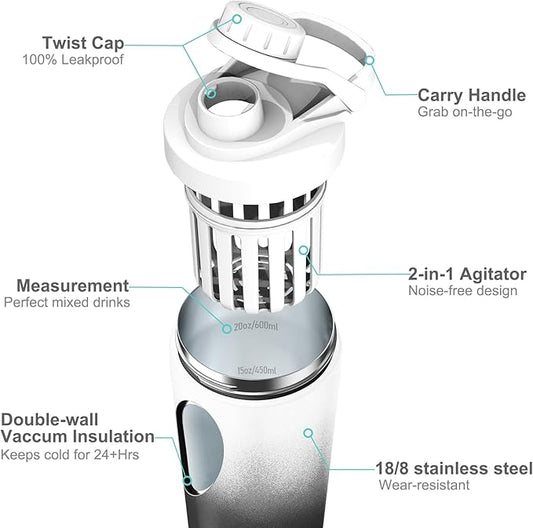 Stainless Steel Shaker Bottle with Noise-Free Design - Patented 24 oz Insulated Metal Shakers Bottles Cup for Protein Mixes and Pre Workout 100% Leak Proof (Day Night)