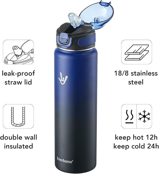 Enerbone 32 oz Insulated Water Bottle, Stainless Steel Bottle with Carrying Strap, Double-Wall Vacuum Insulation Design, Leakproof Sports Bottle with Straw, Keep Drinks Cold or Hot for Hours
