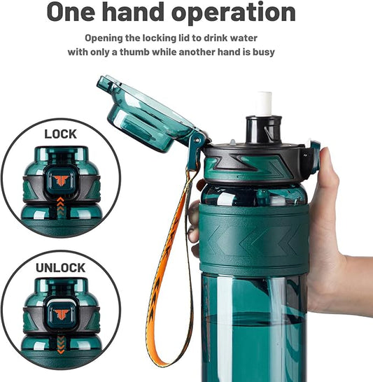 TKK Sports Water Bottles with Removable Straw 34 oz Leak-proof Flip Top Lid BPA Free Tritan Bottles with Strap for School, Fitness, Gym, Outdoor, Green