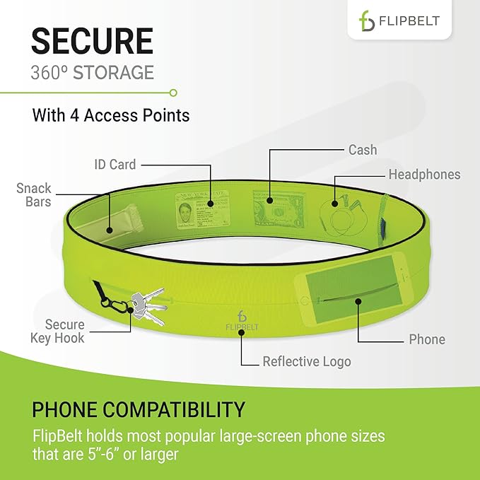 - MONEY & PHONE POUCH: The FlipBelt features 4 pocket openings to slip in all your must-have items, like cards, cash, and earphones, and it even has an internal key hook for added security. It’s bounce-free storage for your phone during your workout and is compatible with screens 5"–6" and larger.