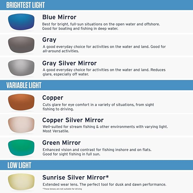 - LENS COLOR: Blue Mirrored Polarized is best for bright, full-sun situations on the open water and offshore.
