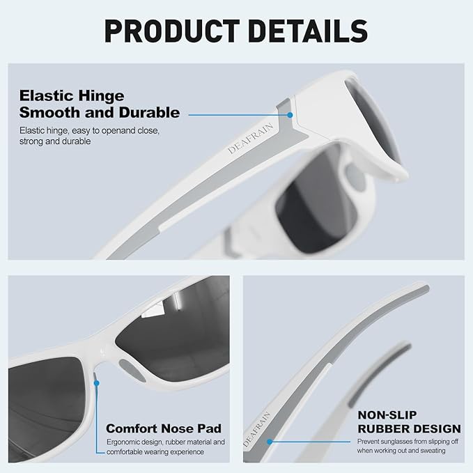- EXCELLENT HD POLARIZED LENS- 1.0mm Polarized Tac Scratch-Resistant Lenses –100% Full Spectrum UV protection against the sun's harmful rays. DEAFRAIN Polarized Lens delivers high contrast, crisp definition, and peak visual acuity. Not only perfect for your weekend adventures, but also an excellent choice for your weekday commute.