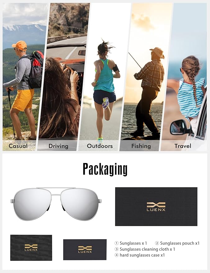 LUENX Aviator Sunglasses for Men Women Polarized - UV400 Protection, Stylish Shades, Driving, Outdoor Activities
