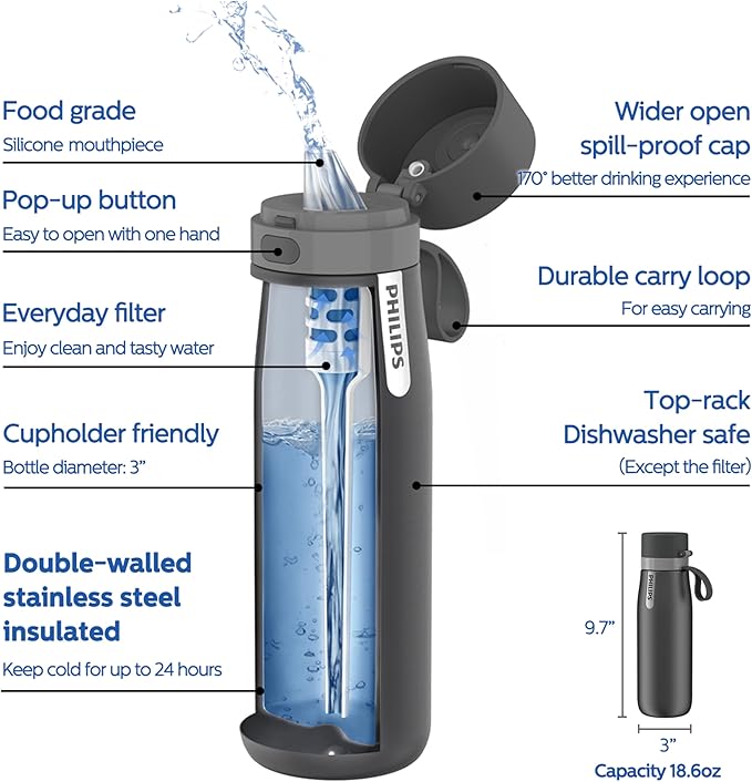 - ā šš§š£šØš² šš„ššš§ & ššš¬šš²: Enjoy of cleaner, fresher-tasting drinking water on-the-go with the Philips GoZero Everyday water filter bottle that instantly improves the taste of water by reducing chlorine and particulates (taste and odor). The activated carbon fiber filter instantly transforms tap water into cleaner, tastier & healthy drinking water.