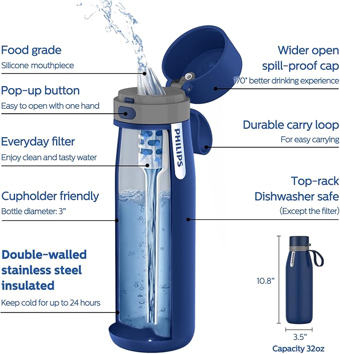 - 𝐄𝐧𝐣𝐨𝐲 𝐂𝐥𝐞𝐚𝐧 & 𝐓𝐚𝐬𝐭𝐲: Enjoy cleaner, fresher-tasting water on the go with the Philips GoZero Everyday Filtered Water Bottle. The activated carbon fiber filter reduces chlorine and particulates, instantly improving water taste and odor. Experience healthier, tastier drinking water wherever you are.