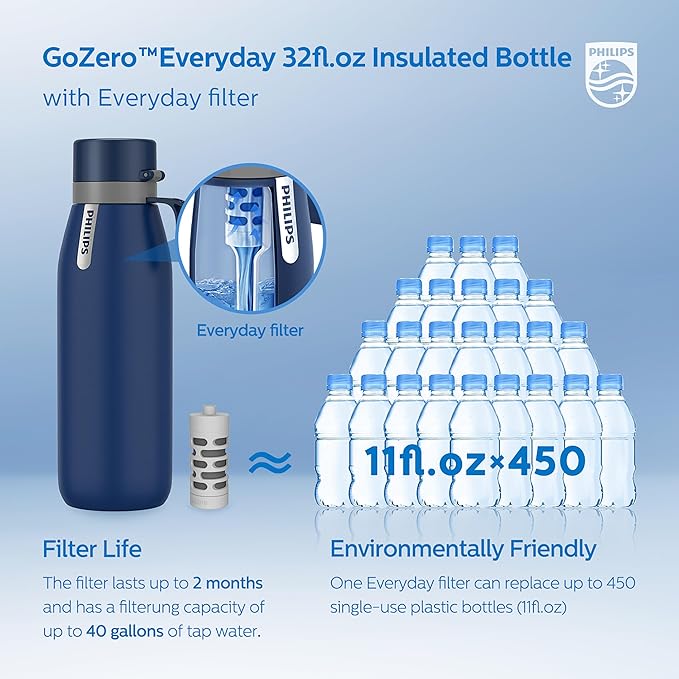 - 𝐆𝐨𝐨𝐝 𝐅𝐨𝐫 𝐄𝐧𝐯𝐢𝐫𝐨𝐧𝐦𝐞𝐧𝐭: Replace up to 450 single-use plastic bottles with one Philips GoZero Everyday filter. Using this reusable water bottle helps reduce your carbon footprint and supports a healthier planet by cutting down on disposable bottle use.