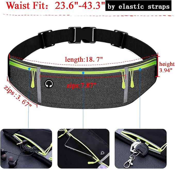 - 【Adjustable Waist Strap】You don't need to search for the right size of running waist band anymore. It has 2 size optional. Small size fits waist size from 29 inch to 37 inch and large size fits waist from 34 inch to 47 inch with fully adjustable elastic band that secures fanny pack comfortably around waist.