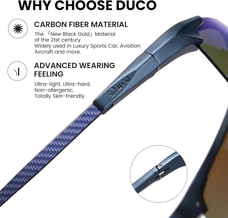 - 【CARBON FIBER TEMPLE STRENGTH】: Carbon fiber temples are ultra-light, ultra-hard, flexible, corrosion-resistant, non-allergenic, non-irritating, totally skin-friendly. Good choice for Driving, Fishing, Climbing, Running, Hiking, Cycling, Skiing, Boating.