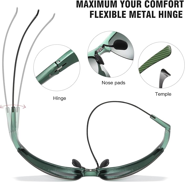 - 【CARBON FIBER TEMPLE STRENGTH】: Carbon fiber temples are ultra-light, ultra-hard, flexible, corrosion-resistant, non-allergenic, non-irritating, totally skin-friendly. Good choice for Driving, Fishing, Climbing, Running, Hiking, Cycling, Skiing, Boating.