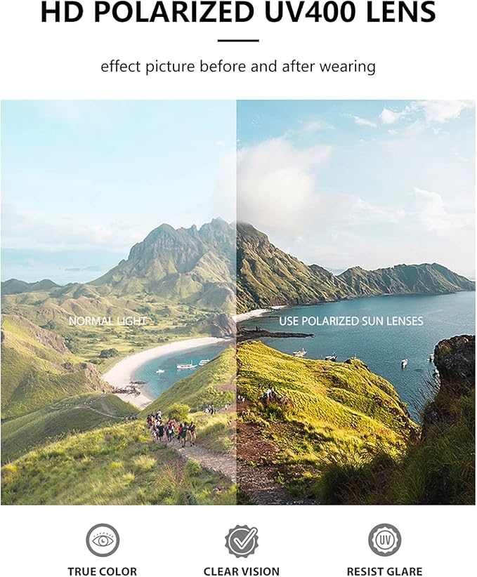 - UV400 Protection: Polarized lenses block 100% of harmful UVA, UVB and UVC rays up to 400nm. Restore true color, eliminate reflected or scattered light, improve contrast. It is better for your eyes that they are more comfortable.
