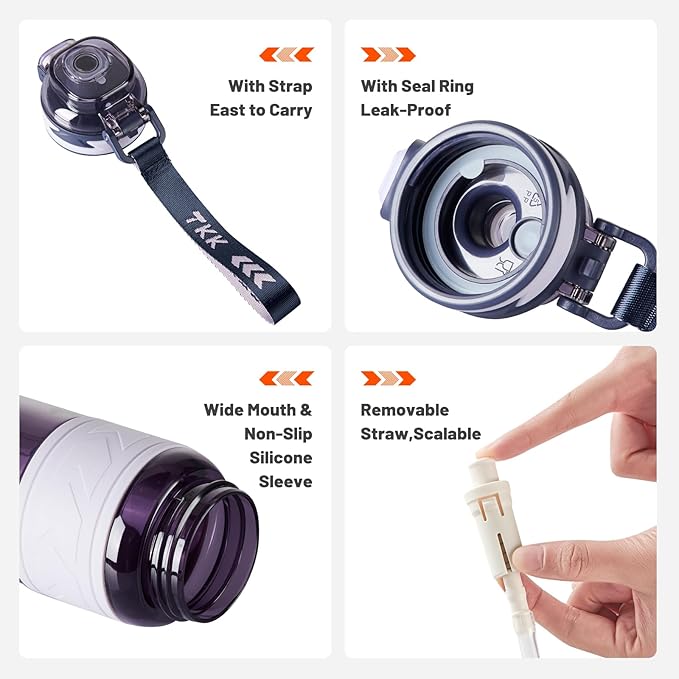 TKK Sports Water Bottles with Removable Straw 34 oz Leak-proof Flip Top Lid BPA Free Tritan Bottles with Strap for School, Fitness, Gym, Outdoor, Purple