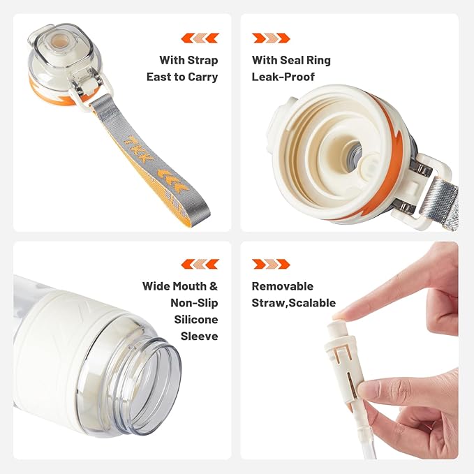 TKK Sports Water Bottles with Removable Straw 34 oz Leak-proof Flip Top Lid BPA Free Tritan Bottles with Strap for School, Fitness, Gym, Outdoor, White