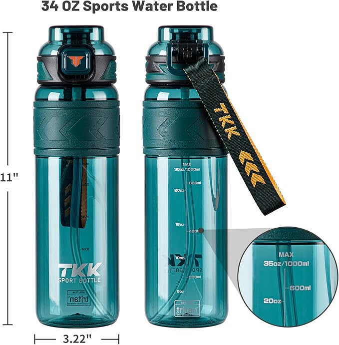 TKK Sports Water Bottles with Removable Straw 34 oz Leak-proof Flip Top Lid BPA Free Tritan Bottles with Strap for School, Fitness, Gym, Outdoor, Green