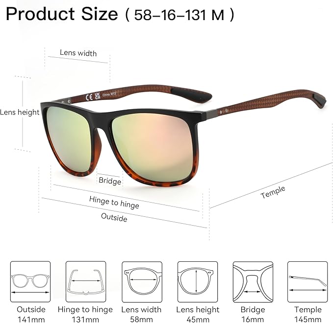 - Gift Ideas Package: Sunglasses*1, microfiber pouch*1, polarized test card*1, glasses box*1. It is also a gift packaged ready, making it a wonderful yet practical gift idea for friends and family.