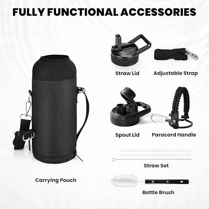 - What You'll Get: We offer Continuous After-sales Service and 100% customer satisfaction against any leakage or insulation failure. You purchase contains: RAYMYLO Water Bottle, Carrying Pouch, Straw Lid with 2 Straws & Straw Brush, Spout Lid, Paracord Handle, Bottle Brush