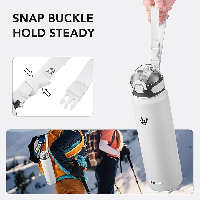 Enerbone 32 oz Insulated Water Bottle, Stainless Steel Bottle with Carrying Strap, Double-Wall Vacuum Insulation Design, Leakproof Sports Bottle with Straw, Keep Drinks Cold or Hot for Hours