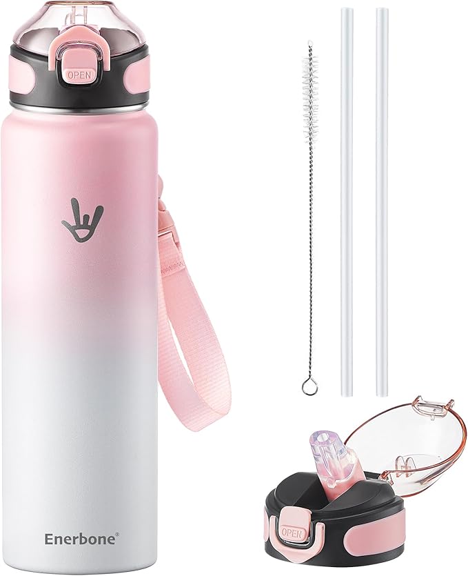 Enerbone 32 oz Insulated Water Bottle, Stainless Steel Bottle with Carrying Strap, Double-Wall Vacuum Insulation Design, Leakproof Sports Bottle with Straw, Keep Drinks Cold or Hot for Hours
