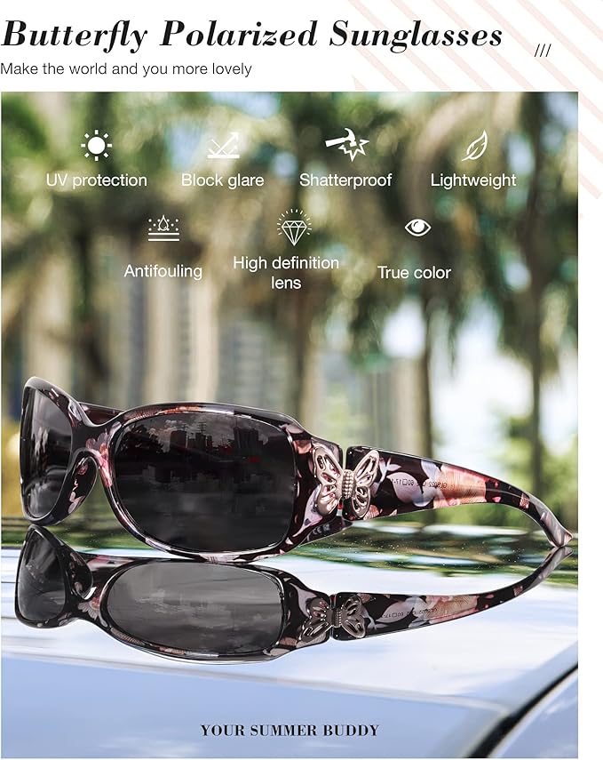 IGnaef Polarized Sunglasses for Women, Trendy Wrap Around Jackie-O Style with Butterfly Decoration IF022
