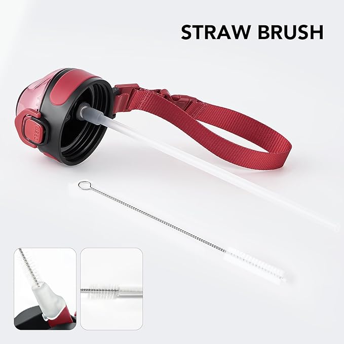 - Humanized Design: The one-hand operation button allows for easy access to water. Highly suitable for boys and girls, and all ages. The flip-top lid of the insulated bottle is used a secure lock, making it dust-free and leak-proof. The included straw brush makes maintaining your bottle's cleanliness uncomplicated and efficient.