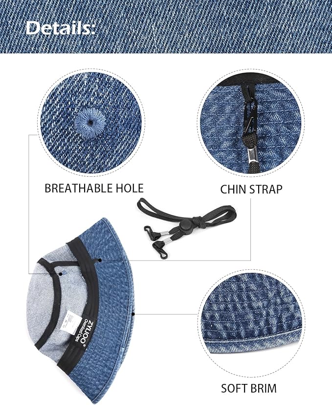 - Windproof & Stylish Hat: Zylioo Denim Bucket Hat With Adjustable Chin Strap Secures Your Hat Even On Breezy Days, So You Can Enjoy Travel, Beach, Or Hiking Without Worry. Lightweight Design Offers All-Day Sun Protection With A Fashion-Forward Look.