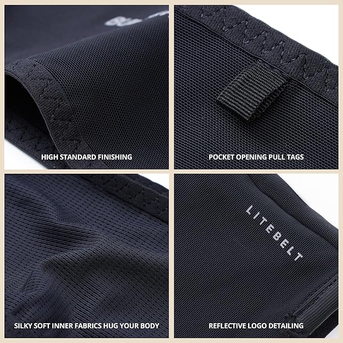 Build & Fitness LiteBelt Running Belt – 4 Quick Top-Access Pockets –Flip Waist Pack, Running Phone Holder – Fits All Size Phones, Keys, Cards, Earpods, GUs – for Men and Women (Black, S)