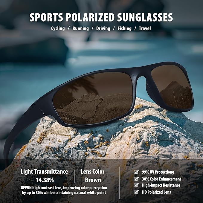 - UV PROTECTION: Ofwin UV400 protection sunglasses provide exceptional sun protection, ensuring your eyes stay shielded from harmful UV rays. Whether you're on the beach,hiking,driving,fishing,or cycling,these sunglasses are designed to keep your vision clear and your eyes safe.