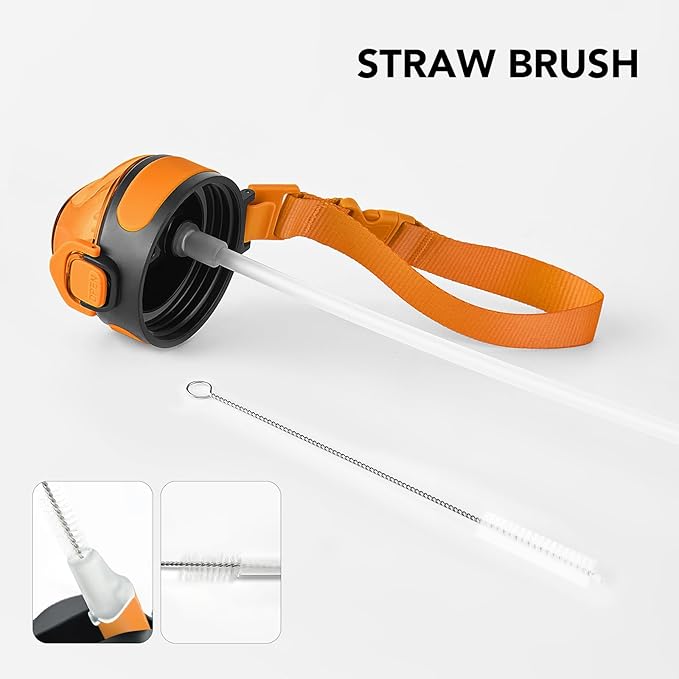 - Humanized Design: The one-hand operation button allows for easy access to water. Highly suitable for boys and girls, and all ages. The flip-top lid of the insulated bottle is used a secure lock, making it dust-free and leak-proof. The included straw brush makes maintaining your bottle's cleanliness uncomplicated and efficient.