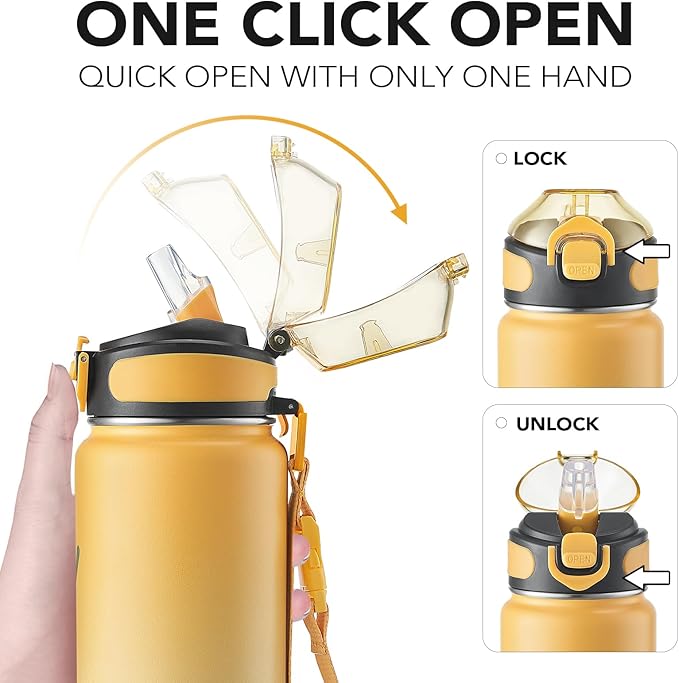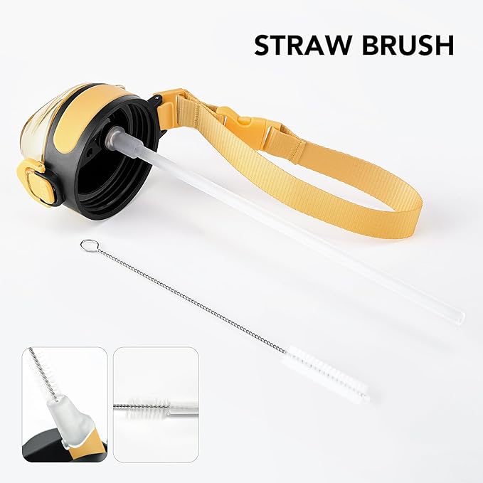 - Humanized Design: The one-hand operation button allows for easy access to water. Highly suitable for boys and girls, and all ages. The flip-top lid of the insulated bottle is used a secure lock, making it dust-free and leak-proof. The included straw brush makes maintaining your bottle's cleanliness uncomplicated and efficient.