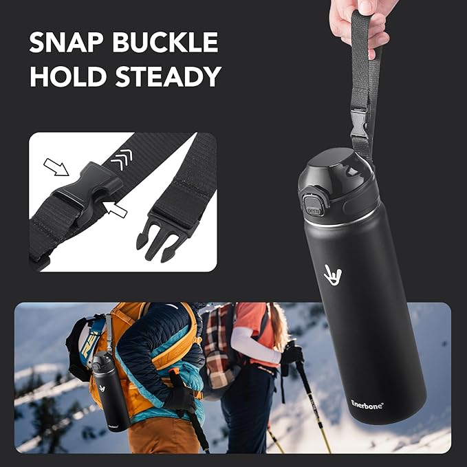Enerbone 24 oz Insulated Water Bottle, Stainless Steel Bottle with Carrying Strap, Double-Wall Vacuum Insulation Design, Leakproof Sports Bottle with Straw, Keep Drinks Cold or Hot for Hours