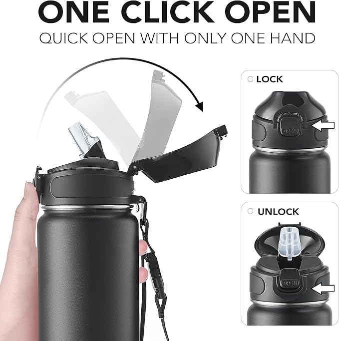 - Humanized Design: The one-hand operation button allows for easy access to water. Highly suitable for boys and girls, and all ages. The flip-top lid of the insulated bottle is used a secure lock, making it dust-free and leak-proof. The included straw brush makes maintaining your bottle's cleanliness uncomplicated and efficient.