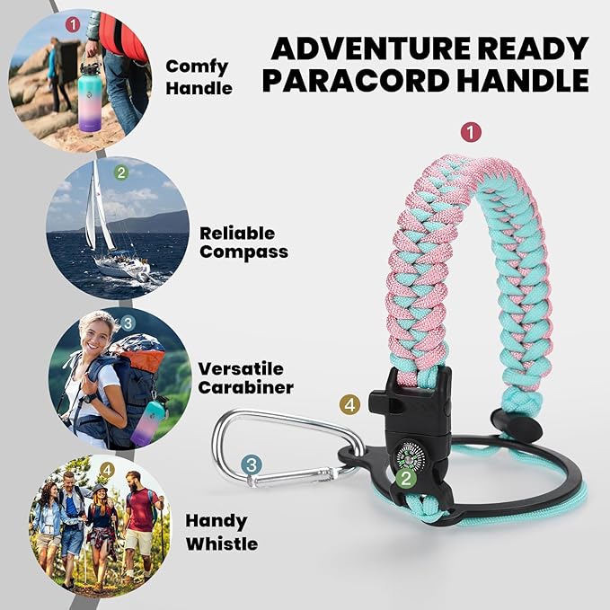 - Iconic Paracord Handle: This insulated water bottle comes with a beautiful hand knit nylon paracord in coordinated color with the water bottle. Configured with a compass and carabiner, this paracord handle is a must-have as a full functional camping / hiking flask