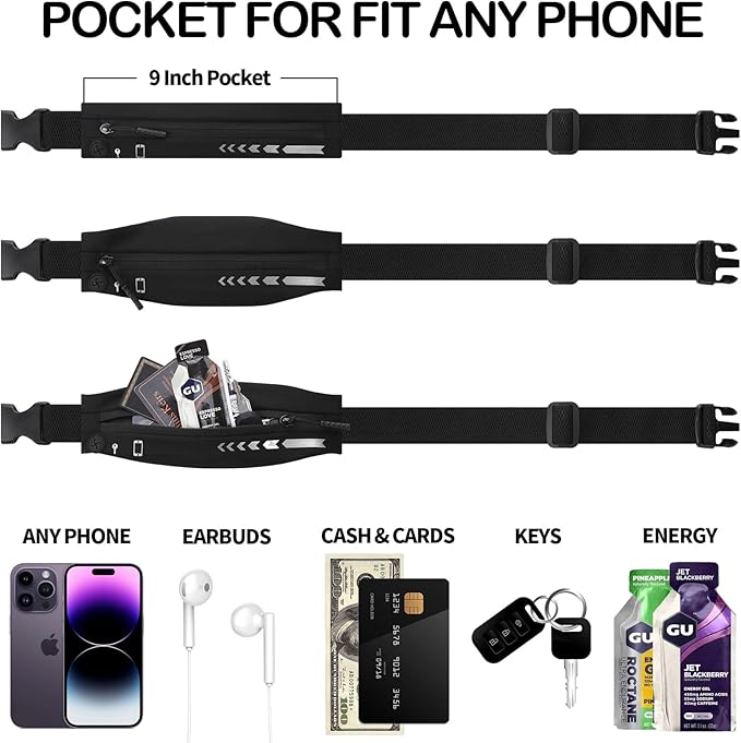 - LARGE POCKET: The pocket lies completely flat with size 9" x 4" x 2" inches is the perfect hands-free solution for a multitude of uses. Carry your phone, keys, cash, cards, earphone and small valuables securely while running.