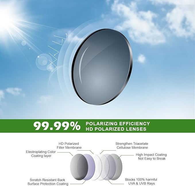 - Polarized & UV Protection – Fanshen men’s polarized sunglasses block 99% harmful UVA/UVB rays with advanced UV lens technology. The high-definition TAC lenses reduce glare from water, roads, and glass, ensuring clear and sharp vision for outdoor sports and daily driving