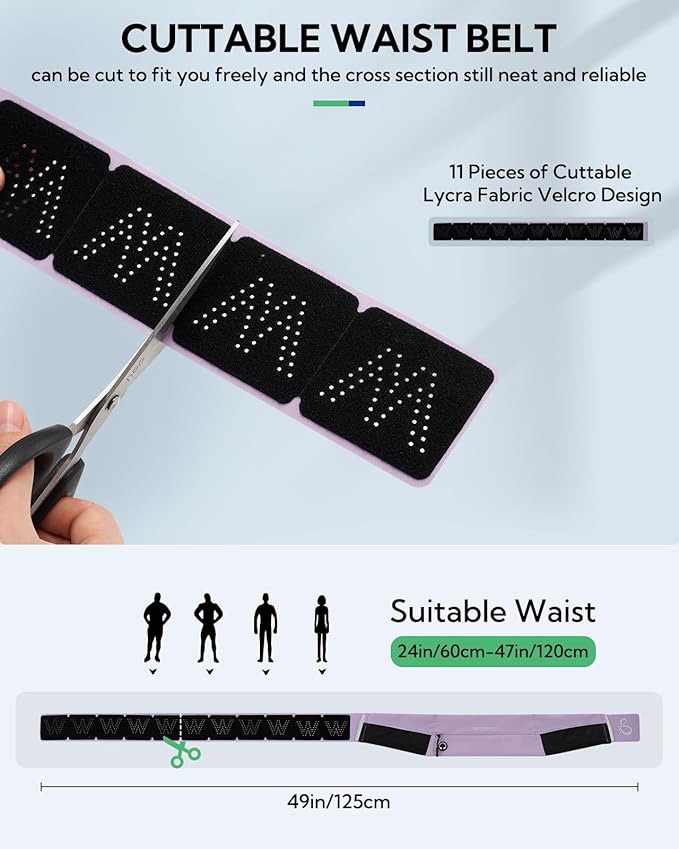 - Hook and Loop Tape Design: The running belt can be cut to fit 24-47in waist size freely, the strong adhesion hook and loop tape used in this running belt for adjustment, ensuring it stays close to the body during running