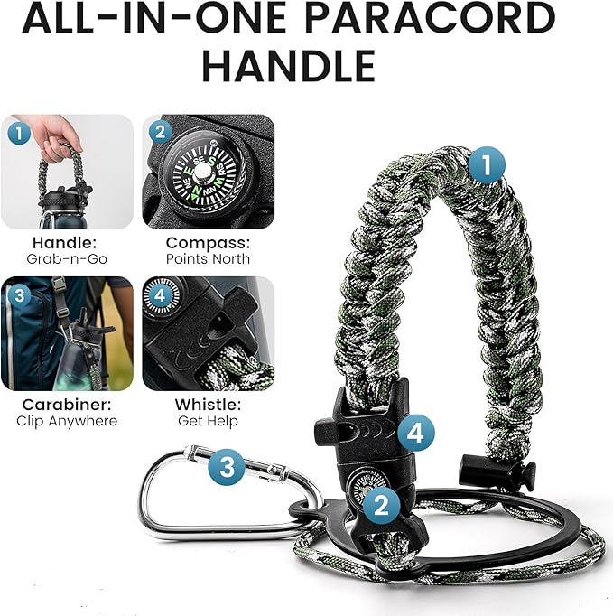 - Adventure Ready Paracord Handle: RAYMYLO 1/3 gallon water jug features a stylish color-coordinated paracord handle with a built-in compass and carabiner clip. This reusable water bottle's paracord handle is lightweight, durable, and perfect for hands-free carrying during hikes, cycling, or camping. Grab & go for spontaneous adventures under the stars!