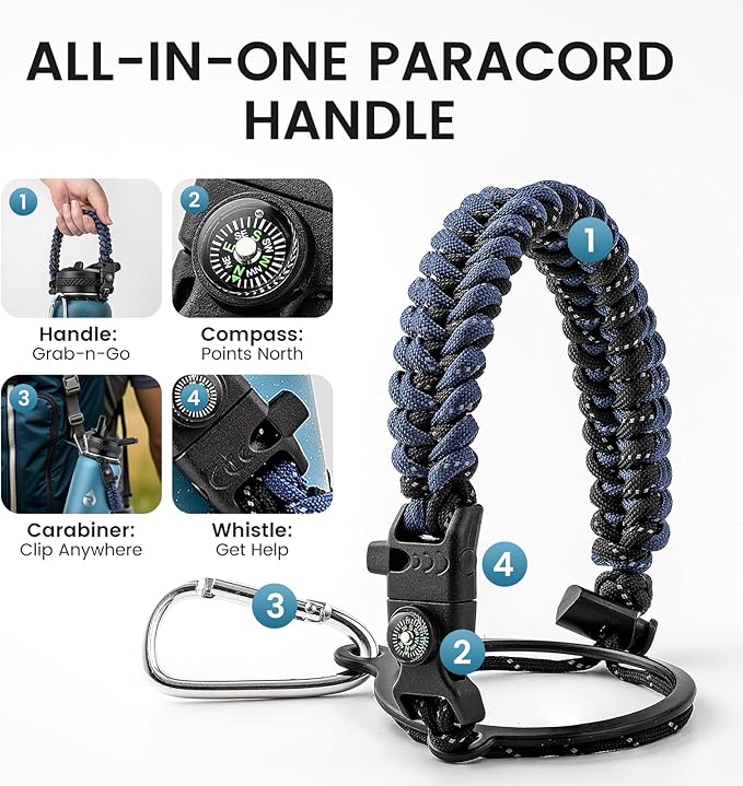 - Adventure Ready Paracord Handle: RAYMYLO 1/3 gallon water jug features a stylish color-coordinated paracord handle with a built-in compass and carabiner clip. This reusable water bottle's paracord handle is lightweight, durable, and perfect for hands-free carrying during hikes, cycling, or camping. Grab & go for spontaneous adventures under the stars!