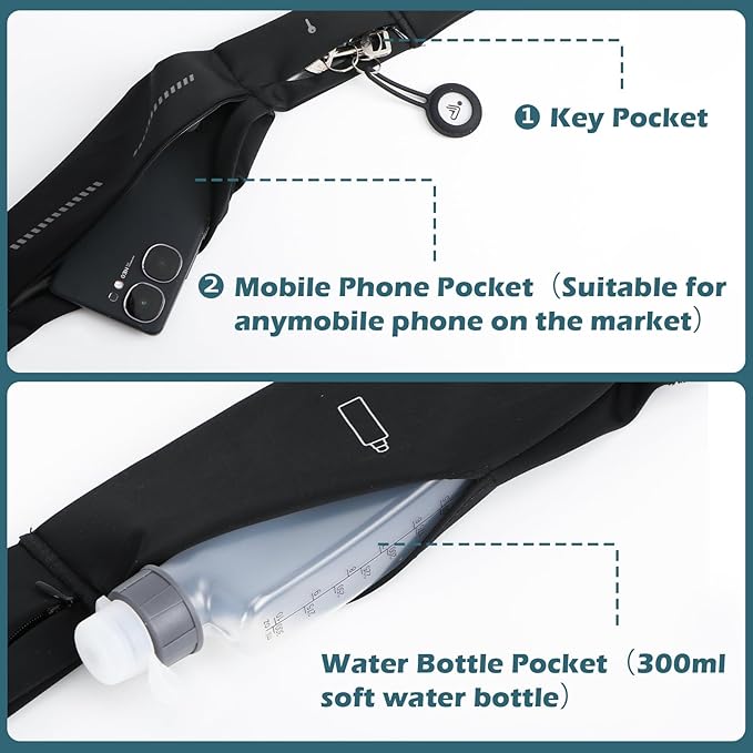 - [3 POCKETS DESIGN] - 3 pockets design fanny pack. Main pocket for cell phone, card. Secondary pocket for keys, Bluetooth headset. And an additional water bottle pocket. Make full use of space to make running easier.