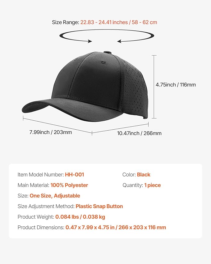 - Comfortable Fit: Our baseball cap is made from 100% polyester material, making it lightweight and breathable for a comfortable wearing experience. It fits head sizes between 22.83-24.41 inches / 58-62 cm, catering to different head sizes, making it the ideal choice for summer outdoor activities