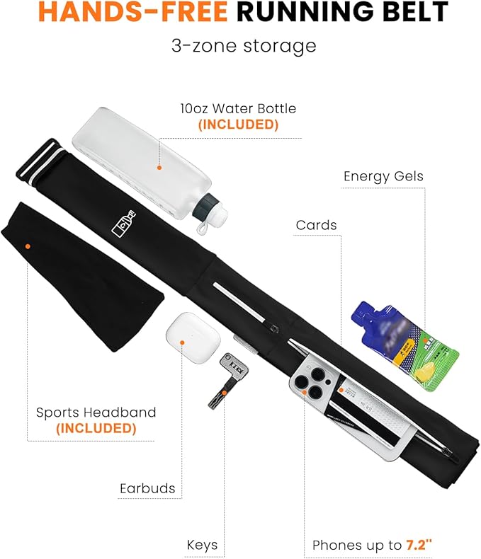 - 【Hydration & Sweat Control Kit】No-bounce fit and secure storage are the basics. What makes this belt different: a 2-in-1 kit with a 10oz curved water bottle for quick mid-run hydration, plus a sweat-wicking headband with ear coverage — blocks sweat in summer, keeps ears warm in winter