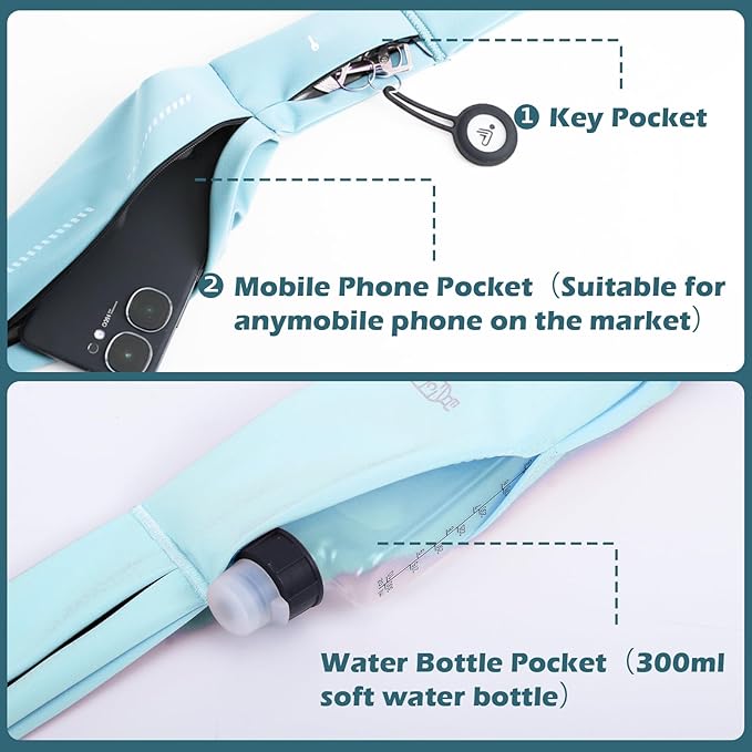 - [3 POCKETS DESIGN] - 3 pockets design fanny pack. Main pocket for cell phone, card. Secondary pocket for keys, Bluetooth headset. And an additional water bottle pocket. Make full use of space to make running easier.